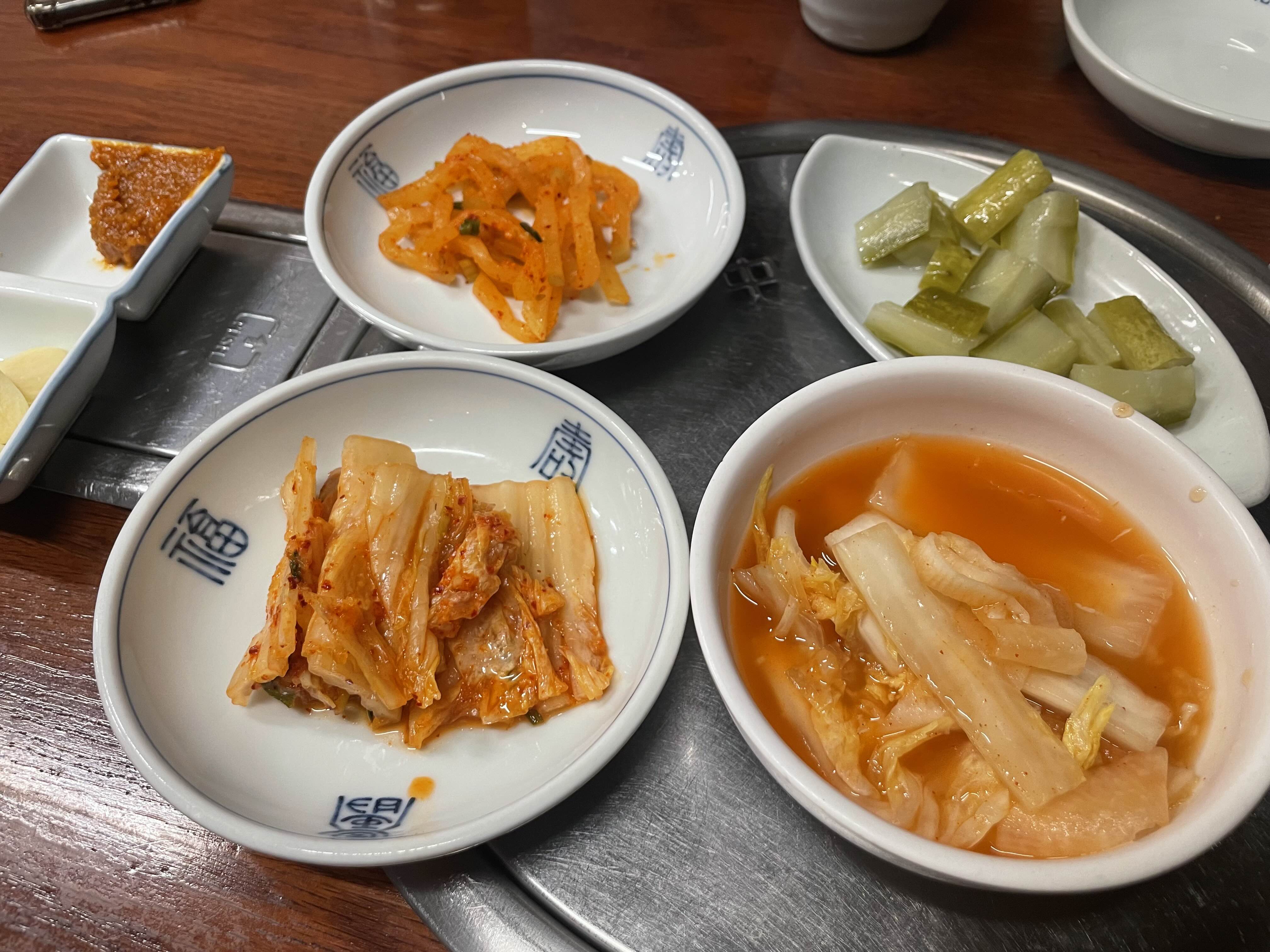 평가옥의 밑반찬입니다. 저는 냉면용 동치미 무 김치가 넘 좋더라고요. 잘못 씹으면 약간 생강이 씹힐 때도 있긴 하지만, 약간 슴슴한 평양냉면과 아주 궁합이 좋아요.