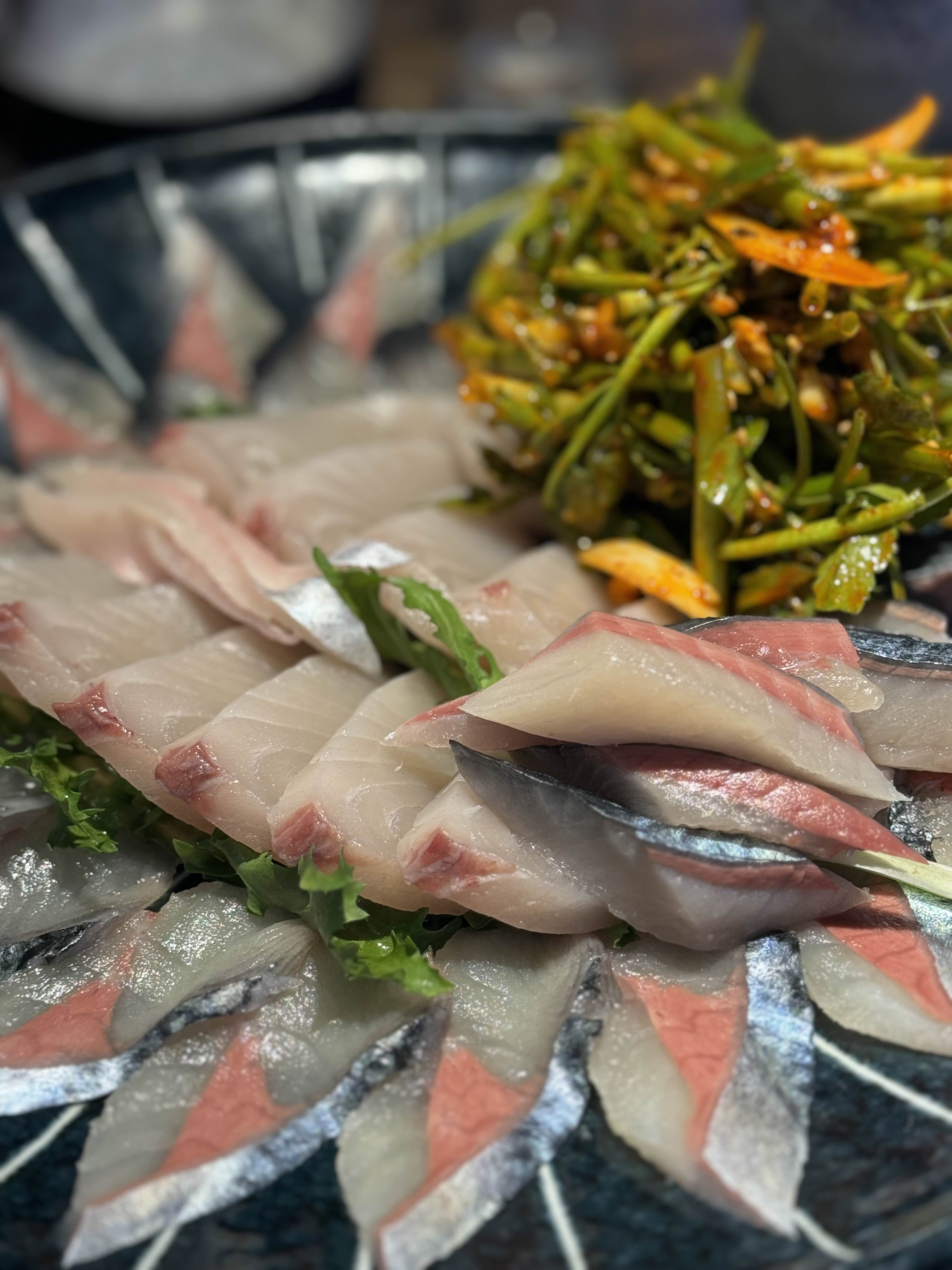가장 먼저 주문한 건 고등어&삼치회 모둠이었어요. 겨울이니만큼 방고회(방어+고등어회)를 고민했지만, 삼치회가 먹고 싶어 고삼회 조합으로 선택했습니다.
